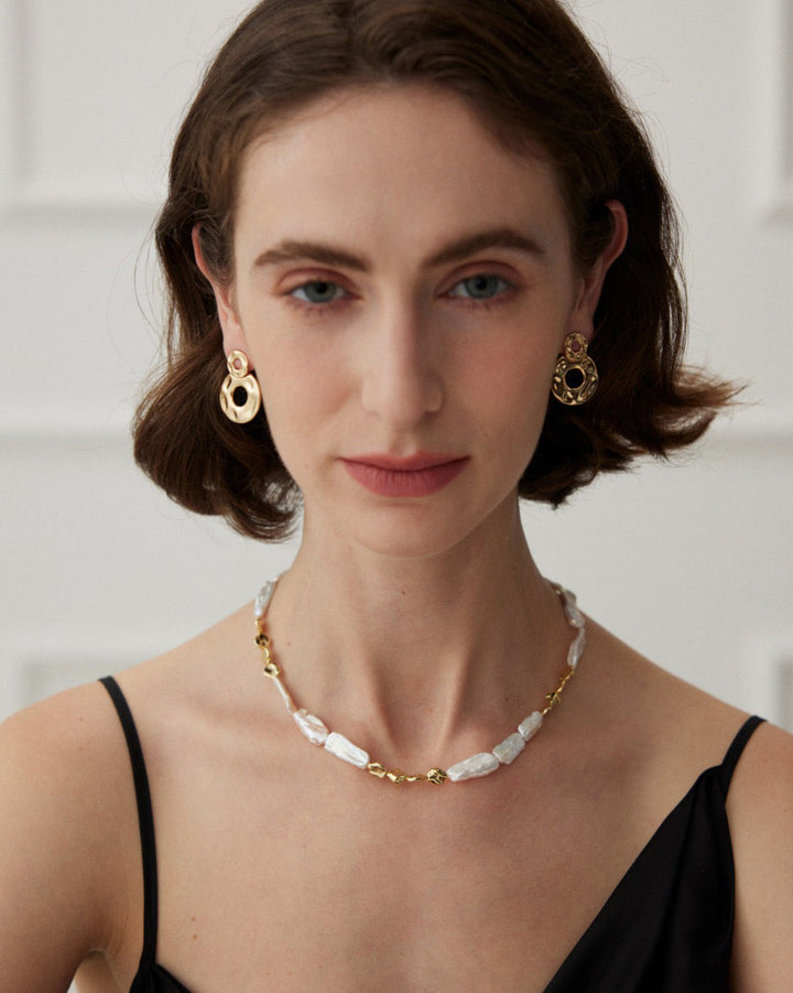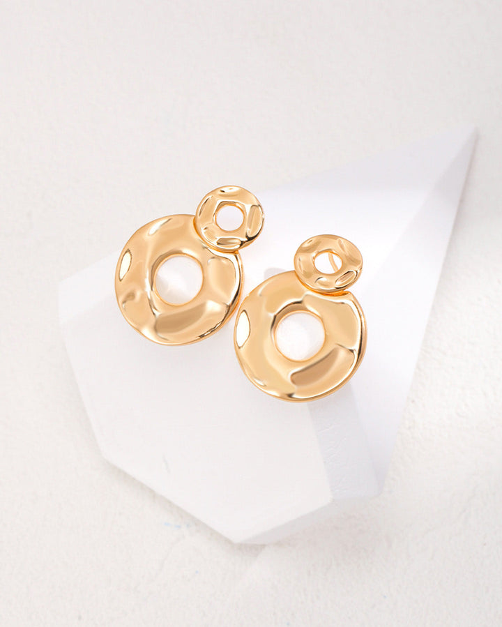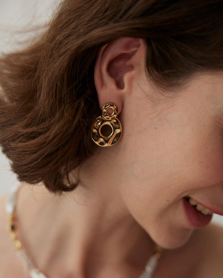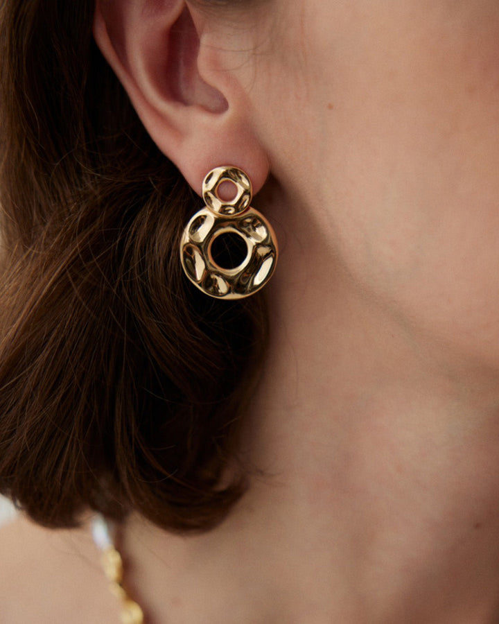 Crafted with meticulous attention to detail. these earrings start with a delicate hollow circle stud. providing a subtle yet striking foundation. From there. a larger hollow circle gracefully dangles. adding dimension and movement to the piece. The gold-plated finishes add a touch of luxury and versatility. allowing these earrings to seamlessly transition from day to night.