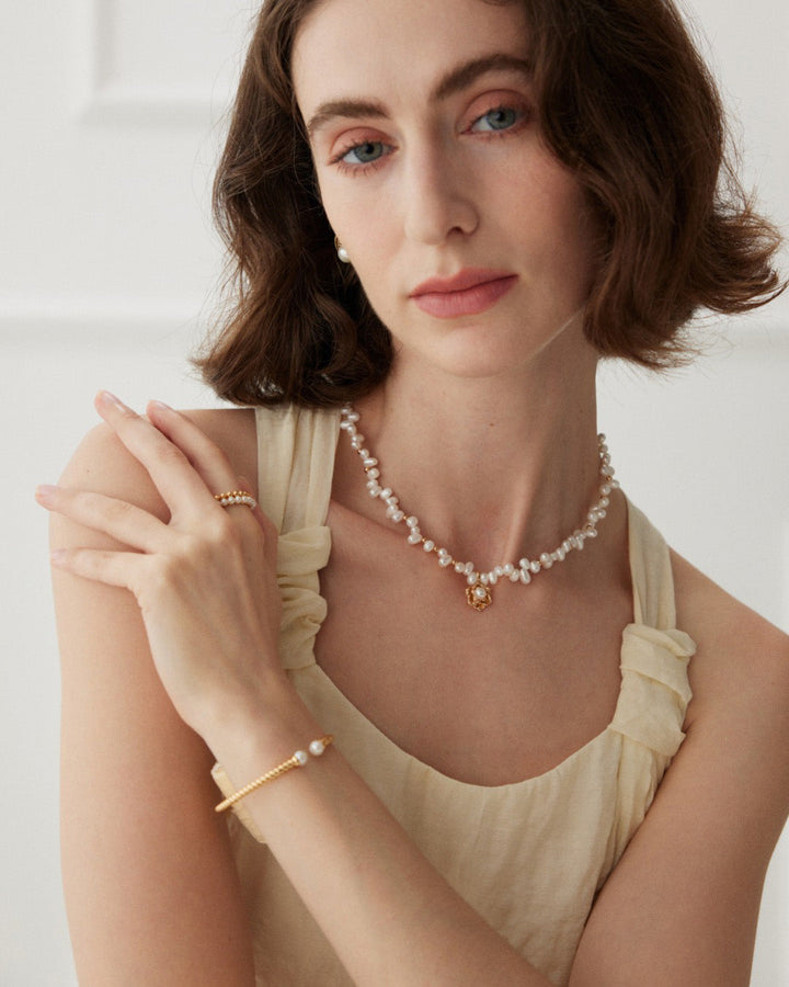 In this necklace. each pearl shines brilliantly. complemented by the camellia flower. yet arranged in an irregular manner. presenting a unique sense of beauty. This design inspiration originates from the novel "The Lady of the Camellias." Just like the protagonist Marguerite in the novel. we all yearn to find a balance between purity and reality. to cleanse ourselves with the purity of a camellia but are inevitably entangled in the complexities of reality.