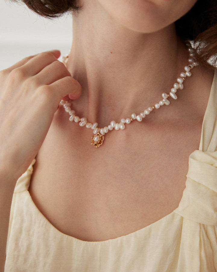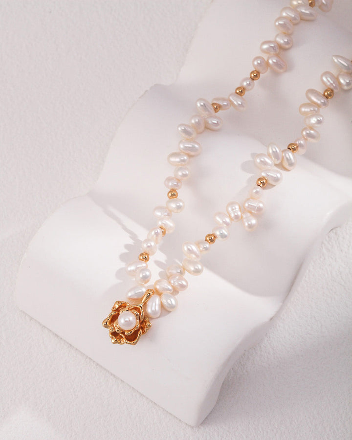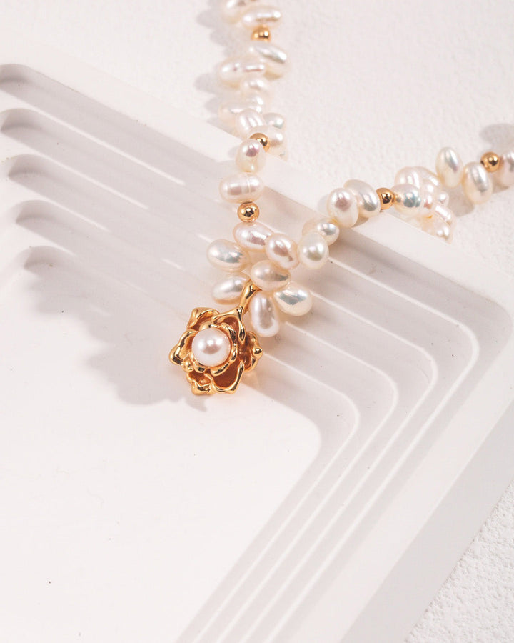 Irregular Pearl Necklace Inlay Camellia Pendant